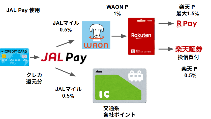 経路は以下画像の通りでJALペイと同様、最終的には楽天ペイでのショッピング利用。楽天証券での投資信託の買付。交通系ICカードにて公共交通機関の利用になります。ただ、JALペイ使用時より還元率は0.5%劣ります。
