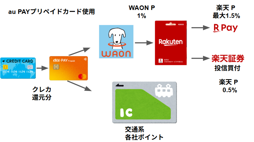 経路は以下画像の通りで、最終的には楽天ペイでのショッピング利用。楽天証券での投資信託の買付。交通系ICカードにて公共交通機関の利用になります。