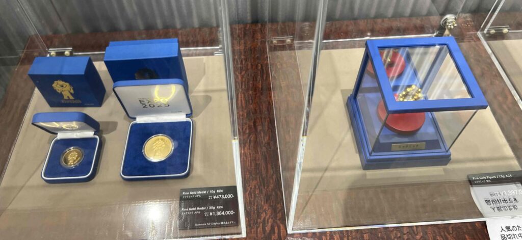 中にはミャクミャクグッズや純金でできたメダルや小判(大きいものだと440万するもの)まで様々ありました!