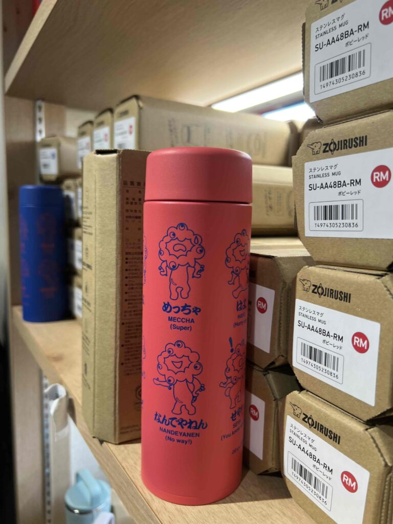 ここで私がお迎えしたのは金のミャクミャクが貯金箱になったグッズでした。他にも↓のミャクミャク柄の水筒を売っているなど、ユニークなものを販売しているショップでした!